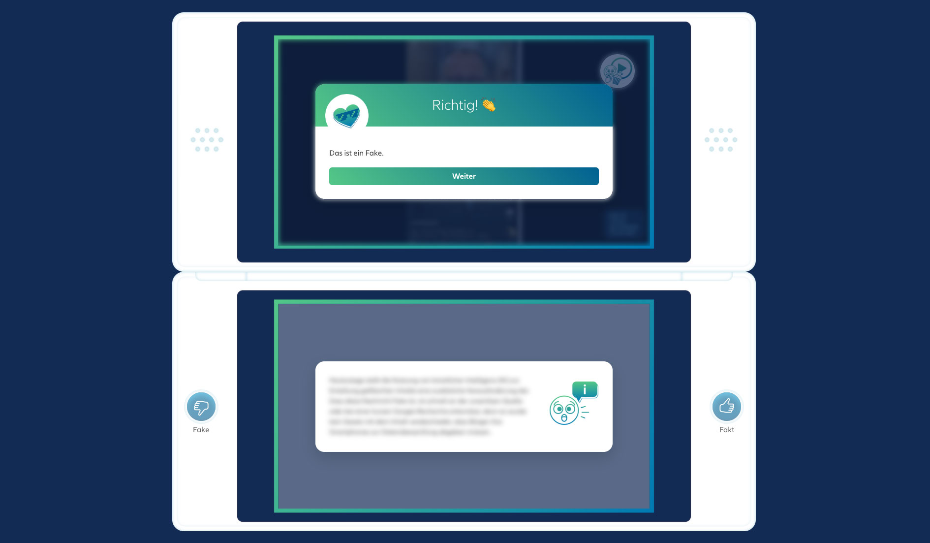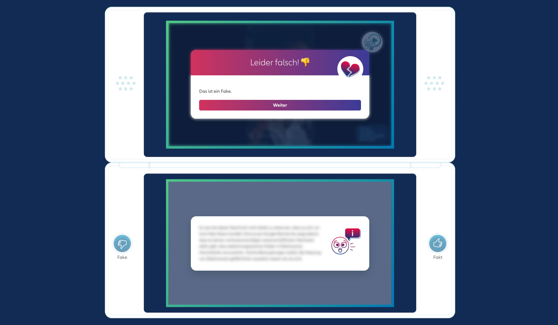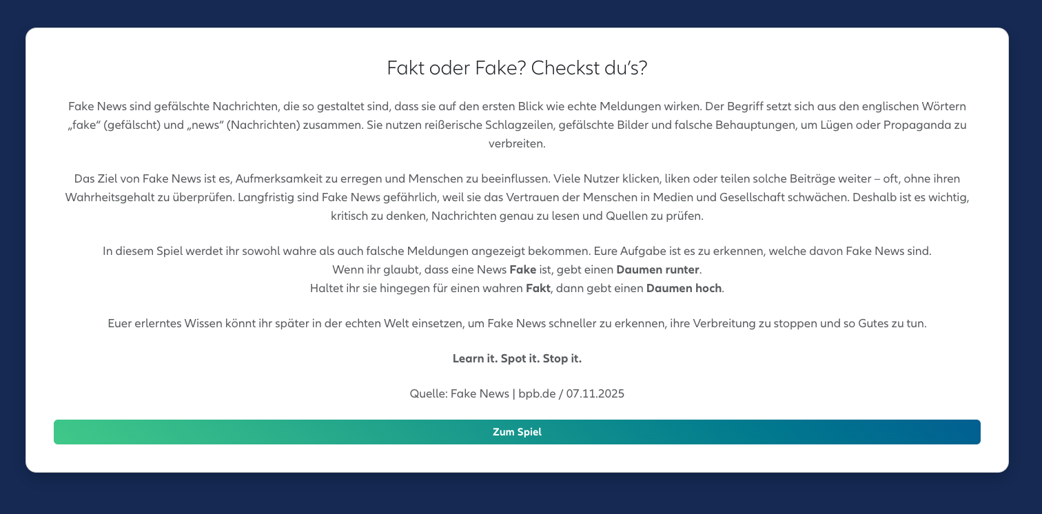 Teams aus drei bis vier Kindern und Jugendlichen bewerten gemeinsam Social-Media-Posts in Form von Bildern und Videos und entscheiden, ob es sich um Fakten oder Fakes handelt. Nach jeder Antwort erhalten die Teams direktes Feedback mit einer kurzen Erklärung. Am Ende jeder Runde wird eine Auswertung mit der Anzahl richtiger und falscher Antworten sowie der benötigten Zeit angezeigt. Aus allen Teams wird ein Gesamtranking ermittelt und die Plätze 1 bis 3 werden mit einem goldenen, silbernen und bronzenen Pokal-Icon ausgezeichnet.