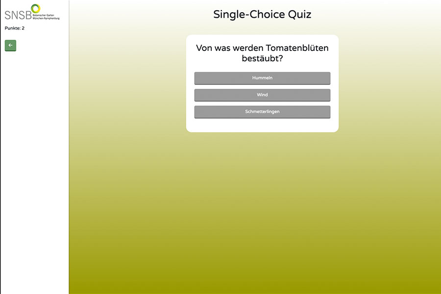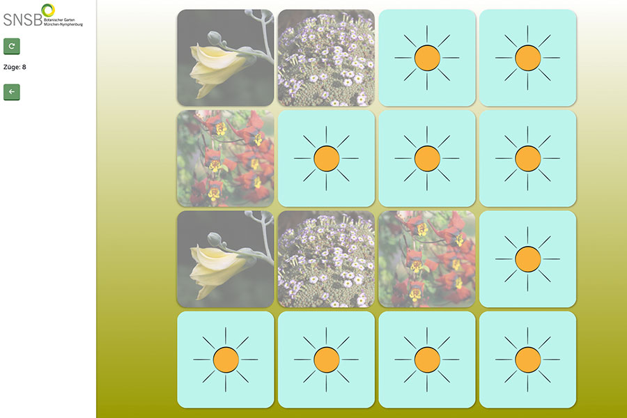 Die Hauptaufgabe war die Programmierung von drei verschiedenen Games. Die Bilder dafür kamen direkt vom Botanischen Garten und wurden von der MMC Agentur in die Spiele eingebaut. Entstanden ist ein Single-Choice-Quiz, das botanisches Wissen unterhaltsam vermittelt, ein Memory mit einzigartigen Bildern aus der Pflanzenwelt sowie ein Schiebepuzzle, das zeigt wie einzigartig verschiedene Blumen aufgebaut sind. Die einzelnen Blütenbestandteile wurden dabei von unserer Grafikerin von Hand gezeichnet und anschließend von unseren Programmierern zu einem Schiebepuzzle umgesetzt.